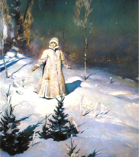 На картине Васнецова «Снегурочка» зима и тёмный лес ночью. В небе блестят алмазные звёзды, а лунный свет освещает поляну. Снег светится голубоватым цветом, и вокруг падают яркие тени.