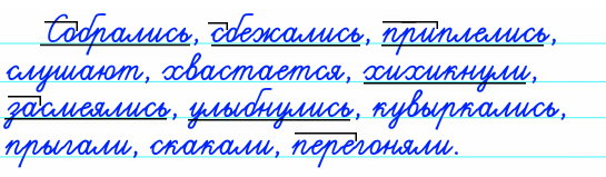 Собрались, сбежались, приплелись, слушают, хвастается, хихикнули, засмеялись, улыбнулись, кувыркались, прыгали, скакали, перегоняли.