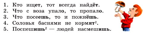 Ищет (наст. вр., ед.ч.), найдёт (буд. вр., ед.ч.), упало (прош. вр., ед.ч.), пропало (прош. вр., ед.ч.), посеешь (буд. вр., ед.ч.), пожнёшь (буд. вр., ед.ч.), кормят (наст. вр., мн.ч.), поспешишь (буд. вр., ед.ч.), насмешишь (буд. вр., ед.ч.)