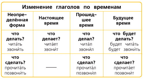 От глаголов, которые в неопределенной форме отвечают на вопрос что делать?, можно образовать все три формы: глагол настоящего, прошедшего и будущего времени.