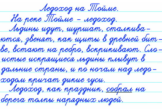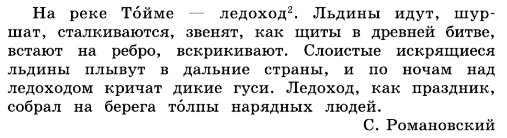 2 часть: Льдины идут, шуршат, сталкиваются, звенят, как щиты в древней битве, встают на ребро, вскрикивают. Слоистые искрящиеся льдины плывут в дальние страны, и по ночам над ледоходом кричат дикие гуси.