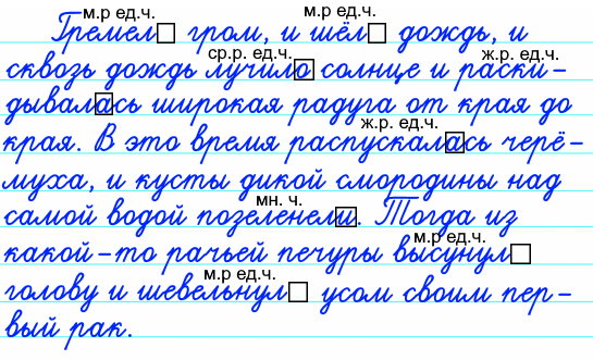 Гремел (муж. род, ед. ч.); шёл (муж. род, ед. ч.); лучило (ср. род, ед. ч.); раскидывалась (жен. род, ед. ч.); распускалась (жен. род, ед. ч.); позеленели (мн. ч.); высунул (муж. род, ед. ч.); шевельнул (муж. род, ед. ч.).
