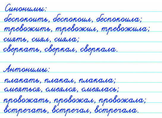 №214. Найдите в словаре синонимов (с. 152) и антонимов (с. 153) по две пары глаголов. Запишите их сначала в неопределенной форме, а затем – в форме прошедшего времени мужского и женского рода единственного числа.
