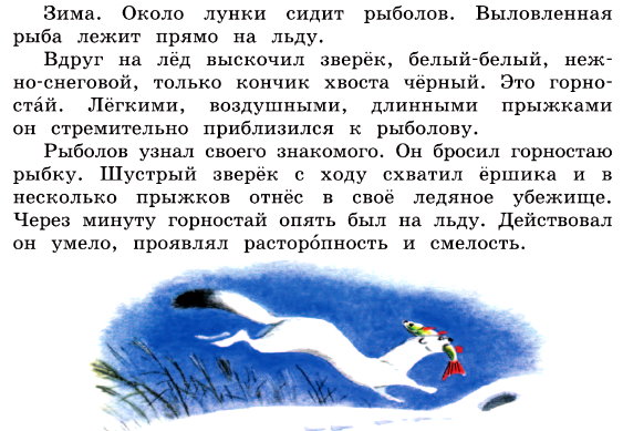 Рыболов ловил рыбу на льду около лунки. Вдруг на лёд выскочил горностай — белый-белый, с чёрным кончиком хвоста. Рыболов бросил горностаю рыбку, и тот шустро схватил её. Горностай в несколько прыжков отнёс рыбку в своё ледяное убежище.