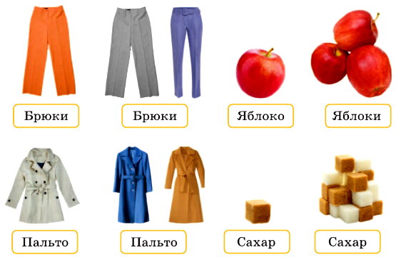 По рисункам и словам мы можем догадаться, что не все имена существительные изменяются по числам. Так, только яблоко — яблоки имеют разные формы для единственного и множественного числа. Остальные слова остаются неизменными, вне зависимости от количества предметов, которые они обозначают.