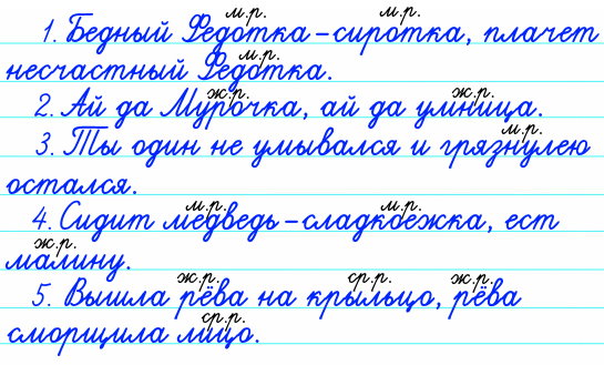 - Спишите любые три предложения. Проверьте себя. Над именами существительными укажите род.