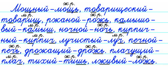 - Слова с мягким знаком (ь) на конце после шипящих у существительных женского рода.