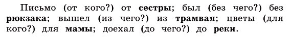 Имена существительные в родительном падеже употребляются с предлогами от, без, из, для, до, с, у, возле.