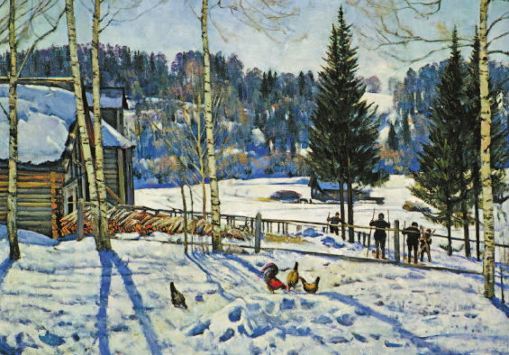 На картине Константина Фёдоровича Юона изображён солнечный день на окраине деревни. Перед нами — старый деревянный дом с забором, рядом — поленница дров. Снег возле дома мягкий и пористый, в нём видны проталины. Стройные берёзы и зелёные ели украшают пейзаж, а на снегу видны голубые тени от деревьев.