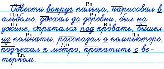 - Выделите в глаголах приставки, подчеркните предлоги. Над каждым именем существительным укажите падеж.