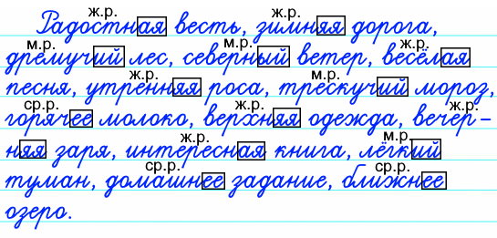- Докажите, что вы правильно написали окончания имен прилагательных. Укажите род имен прилагательных, выделите окончания имен прилагательных.