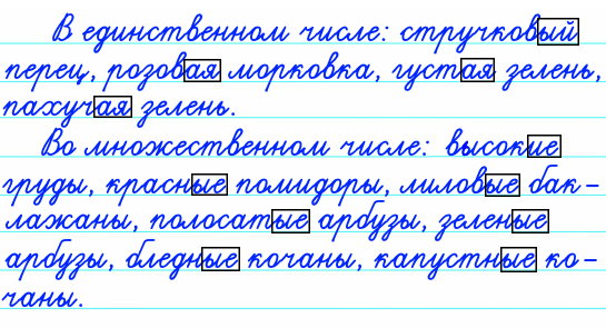 - Выпишите из текста сначала словосочетания имен существительных с именами прилагательными в единственном числе, а затем – с именами прилагательными во множественном числе.