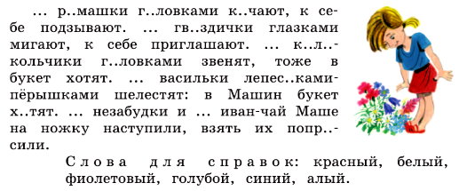 В этом тексте много ярких цветов: белый, красный, синий, голубой, алый и фиолетовый. Цветы «оживают»: качают головками, мигают, звенят, шелестят и приглашают. Текст звучит как песенка.