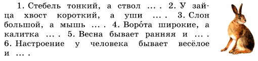 1. Стебель тонкий, а ствол толстый. 2. У зайца хвост короткий, а уши длинные. 3. Слон большой, а мышь маленькая. 4. Ворота широкие, а калитка узкая. 5. Весна бывает ранняя и поздняя. 6. Настроение у человека бывает весёлое и грустное.