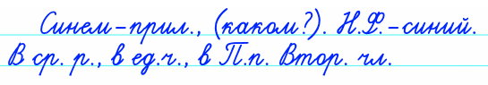 Начальная форма – синий. Употреблено в среднем роде, в единственном числе, в предложном падеже. В предложении является второстепенным членом.