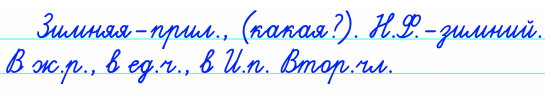 Начальная форма – зимний. Употреблено в женском роде, в единственном числе, в именительном падеже. В предложении является второстепенным членом.