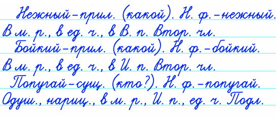 - Разберите любое имя прилагательное как часть речи сначала устно по образцу, затем письменно (см. Памятку «Порядок разбора имени прилагательного», с. 142 – 143).