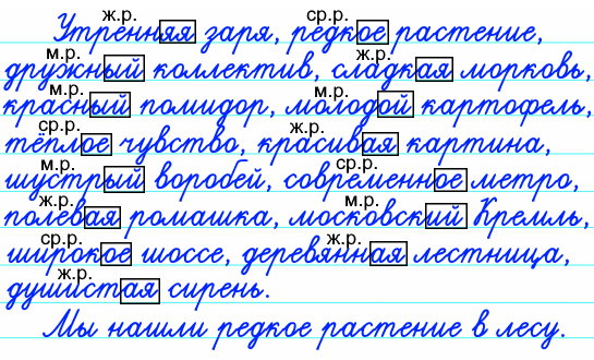 - Запишите составленные словосочетания. Укажите род имен прилагательных, выделите их окончания.