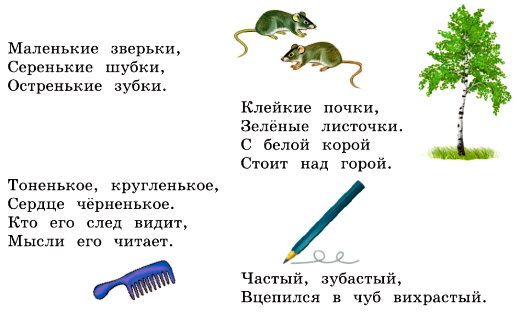 Первую загадку помогают отгадать прилагательные: маленькие (размер), серенькие (цвет), остренькие (форма).