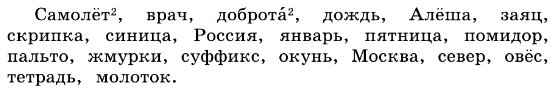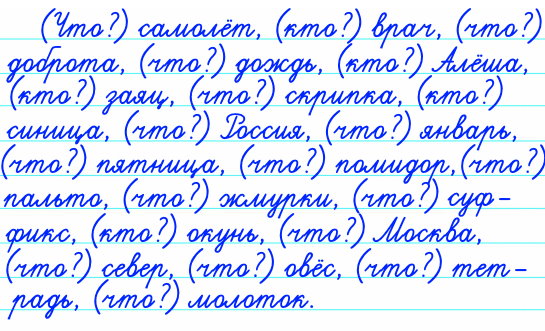 (Что?) самолёт, (кто?) врач, (что?) доброта, (что?) дождь, (кто?) Алёша, (кто?) заяц, (что?) скрипка, (кто?) синица, (что?) Россия, (что?) январь, (что?) пятница, (что?) помидор, (что?) пальто, (что?) жмурки, (что?) суффикс, (кто?) окунь, (что?) Москва, (что?) север, (что?) овёс, (что?) тетрадь, (что?) молоток.