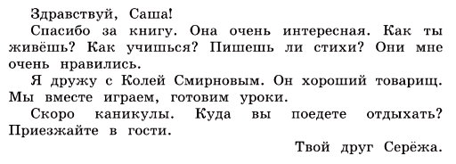 Третья часть: Серёжа упоминает предстоящие каникулы и приглашает Сашу в гости.