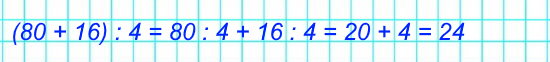 Разделим слагаемые 80 и 16 на 4, полученные результаты 20 и 4 сложим.