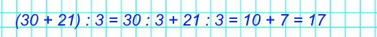 Разделим слагаемые 30 и 21 на 3, полученные результаты 7 и 10 сложим.