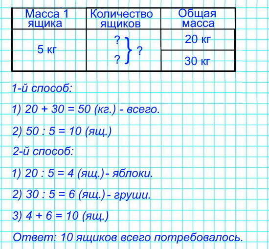 В ящики, каждый из которых вмещает по 5 кг фруктов, разложили 20 кг яблок и 30 кг груш. Сколько всего ящиков потребовалось?