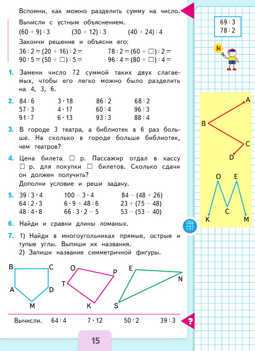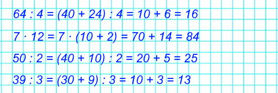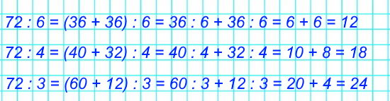 №1. Замени число 72 суммой таких двух слагаемых, чтобы его легко было разделить на 4, на 3, на 6.