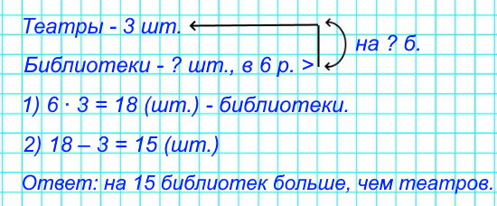 №3. В городе 3 театра, а библиотек в 6 раз больше. На сколько в городе больше библиотек, чем театров?