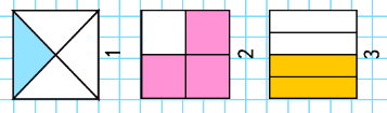 Третий квадрат разделён на 4 равные части, а закрашены 2 части. Найдём две четвёртых: