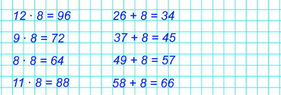 Увеличь в 8 раз числа: 12, 9, 8, 11.