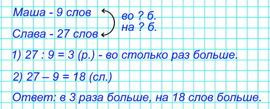 №11. Дети играли в слова. Маша составила 9 слов, а Слава – 27 других слов. Во сколько раз больше слов составил Слава, чем Маша? На сколько у Славы больше слов, чем у Маши?