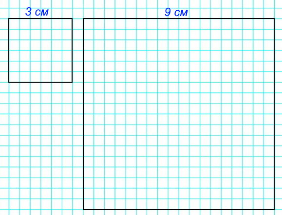 1) Начерти два квадрата: сторона одного 3 см, сторона другого в 3 раза больше. Во сколько раз площадь второго квадрата больше площади первого?