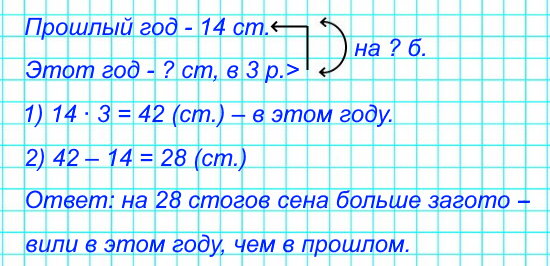 №6. В прошлом году в заповеднике заготовили на зиму 14 стогов сена для подкормки лосей, а в этом году – в 3 раза больше. На сколько больше стогов сена заготовили в этом году?