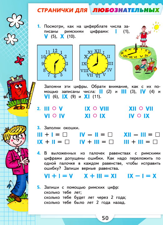 №1. Посмотри, как на циферблате числа записаны римскими цифрами: I (1), V (5), X (10). Запомни эти цифры. Обрати внимание, как с их помощью записаны числа: II (2) и III (3), IV (4) и VI (6), IX (9) и XI (11).