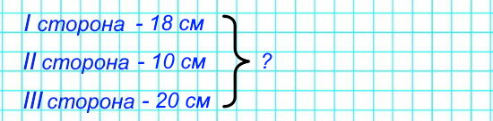 Длина первой стороны треугольника 18 см, второй стороны – 10 см, а третьей 20 см. Найдите периметр треугольника.