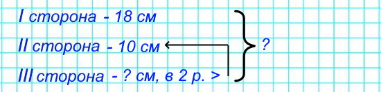 Длина первой стороны треугольника 18 см, второй – 10 см, а третьей в два раза больше, чем второй. Найдите периметр треугольника.