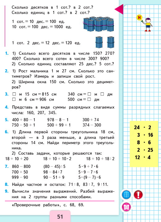 1) Сколько всего десятков в числе 150? 270? 400? Сколько всего сотен в числе 300? 900?