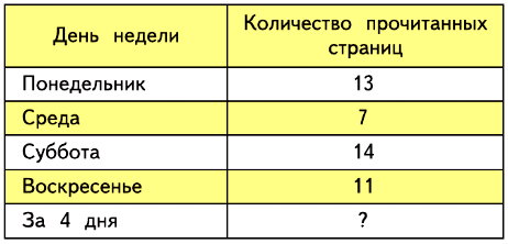 №14. Дима прочитал книгу за 4 дня. Количество страниц, которые он прочитывал за день, Дима записал в такой таблице. Вычисли, сколько страниц в этой книге.