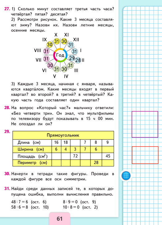 3) Каждые 3 месяца, начиная с января, называют кварталом. Какие месяцы входят в первый квартал? во второй? в третий? в четвертый? Какую часть года составляет один квартал?
