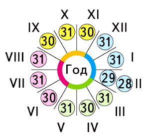 Зимние месяцы: декабрь (XII), январь (I), февраль (II);