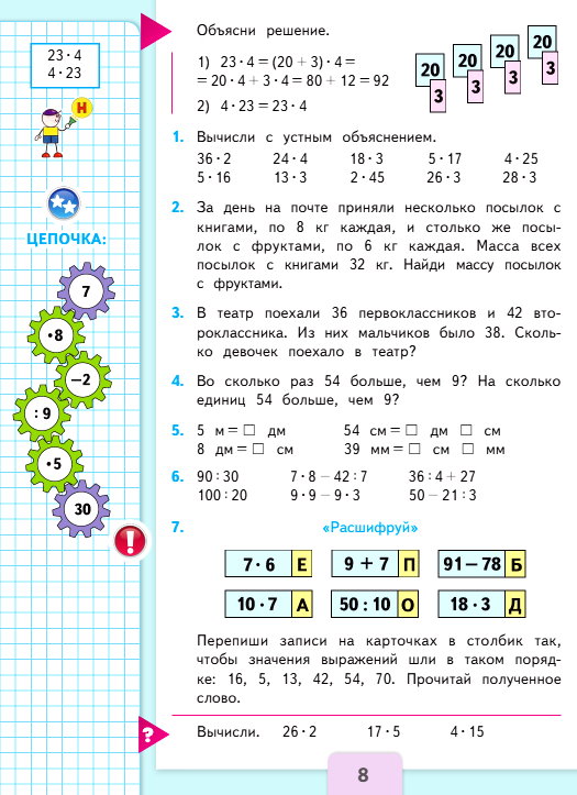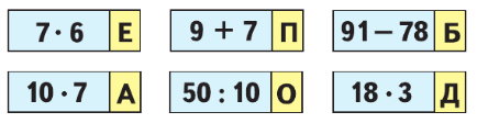 Перепиши записи на карточках в столбик так, чтобы значения выражений шли в таком порядке: 16, 5, 13, 42, 54, 70. Прочитай полученное слово.