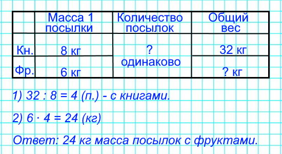 №2. За день на почте приняли несколько посылок с книгами, по 8 книг каждая, и столько же посылок с игрушками, по 6 кг каждая. Масса всех посылок с книгами 32 кг. Найди массу посылок с игрушками.