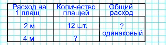Используют обратную пропорциональность: если на один взрослый плащ расходуется ткани в 2 раза больше, чем на детский (4 м вместо 2 м), то из того же количества ткани получится в 2 раза меньше взрослых плащей.
