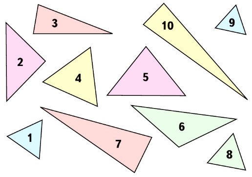 1) 1 группа – равнобедренные треугольники: 2, 3, 5, 6, 7, 10.
