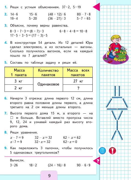 №4. В конструкторе 54 детали. Из 12 деталей Юра сделал электровоз, а из остальных – вагоны. Сколько получилось вагонов, если на каждый пошло по 7 деталей? Выбери правильный ответ и подтверди его решением. Ответ: 6 вагонов; 7 вагонов; 9 вагонов.