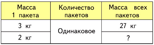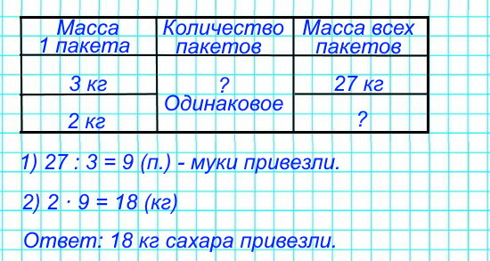В магазин привезли 27 кг муки в пакетах по 3 кг в каждом и столько же пакетов с сахаром по 2 кг в каждом пакете. Сколько кг сахара привезли?