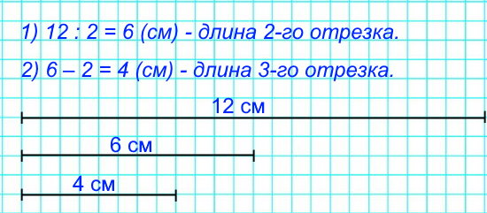 №6. Начерти 3 отрезка: длина первого 12 см, длина второго равна половине длины первого, а длина третьего на 2 см меньше длины второго.