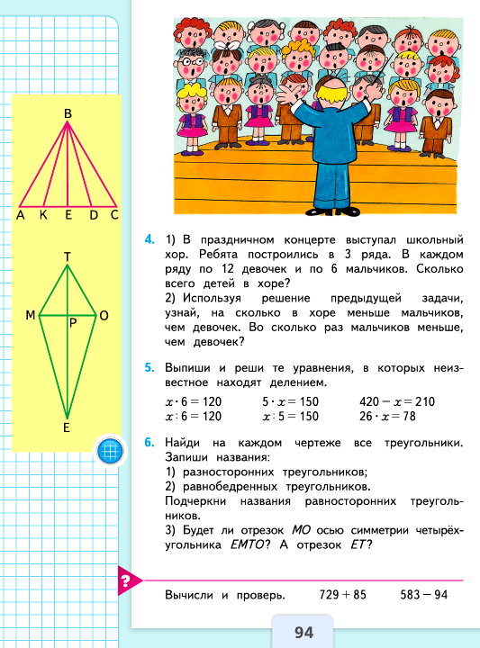 2) Используя решение предыдущей задачи, узнай, на сколько в хоре меньше мальчиков, чем девочек. Во сколько раз мальчиков меньше, чем девочек?